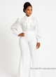 Cet élégant ensemble deux pièces comprend un chemisier blanc cassé à manches longues avec col haut et nœud, manches bouffantes à poignets ajustés, et délicates décorations aux épaules, assorti à un pantalon taille haute ajusté. Le pantalon épouse les hanches et les cuisses avant de s’évaser au bas, offrant une silhouette flatteuse et élancée. Idéal pour les occasions formelles et semi-formelles. Disponible dans toutes les tailles.