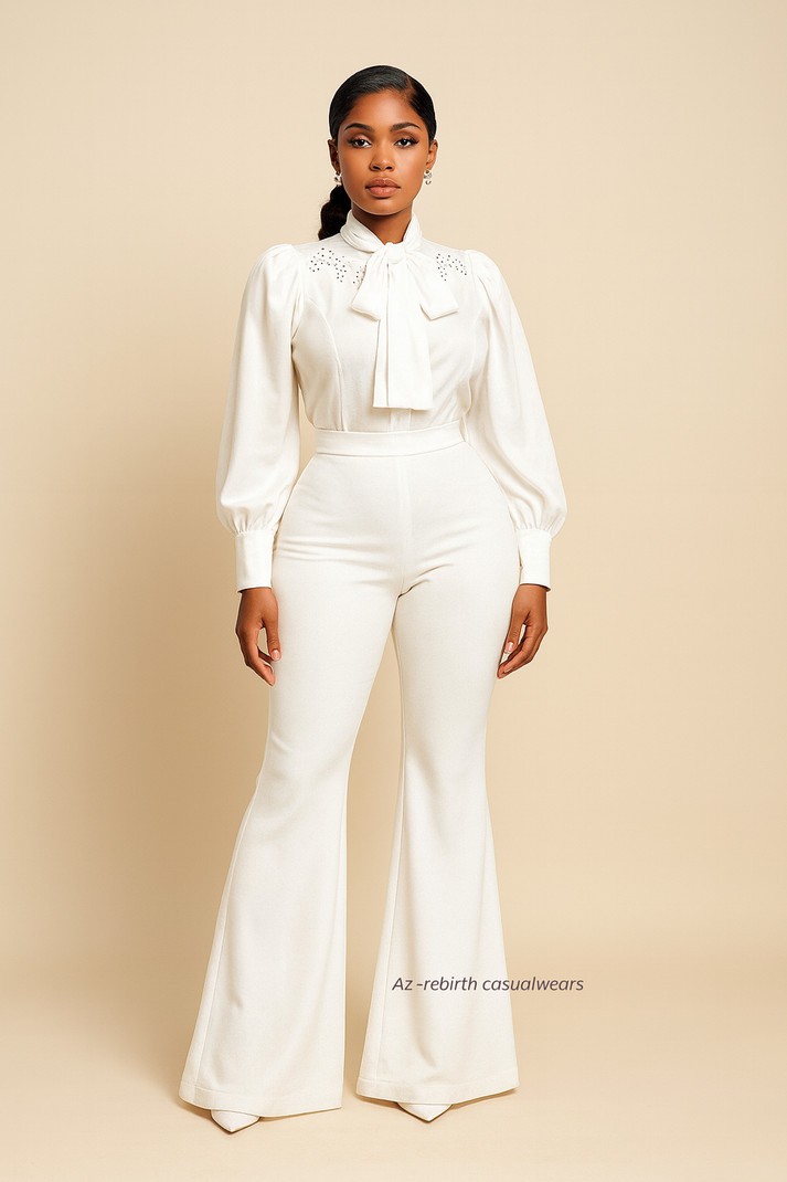 This elegant two-piece set features a long-sleeve off-white blouse with a high neck tie-bow, puffed sleeves with fitted cuffs, and delicate shoulder embellishments, perfectly paired with matching high-waist tailored trousers. The pants fit smoothly through the hips and thighs before flaring at the hem, creating a flattering and elongated silhouette. Perfect for formal and semi-formal occasions. Available in all sizes.