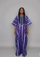 This sophisticated Regal Purple Adire Kaftan is a masterclass in modern cultural fusion, blending the ancient artistry of indigo dyeing with a contemporary, high-fashion silhouette. Hand-crafted from premium, breathable cotton, this garment features vibrant shades of purple and violet achieved through authentic Adire wax-resist techniques, resulting in intricate geometric patterns that are unique to every piece. The dress is elevated by a distinct, structured navy blue yoke at the neckline, detailed with fine vertical silver embroidery that adds a touch of formal refinement. Its voluminous, floor-length drape and wide kimono sleeves offer a regal yet comfortable fit, making it an exceptional choice for high-profile cultural celebrations, elegant evening receptions, or upscale resort gala events. Whether styled for a traditional wedding or a chic art gallery opening, this kaftan guarantees a presence of effortless grace and artistic heritage.