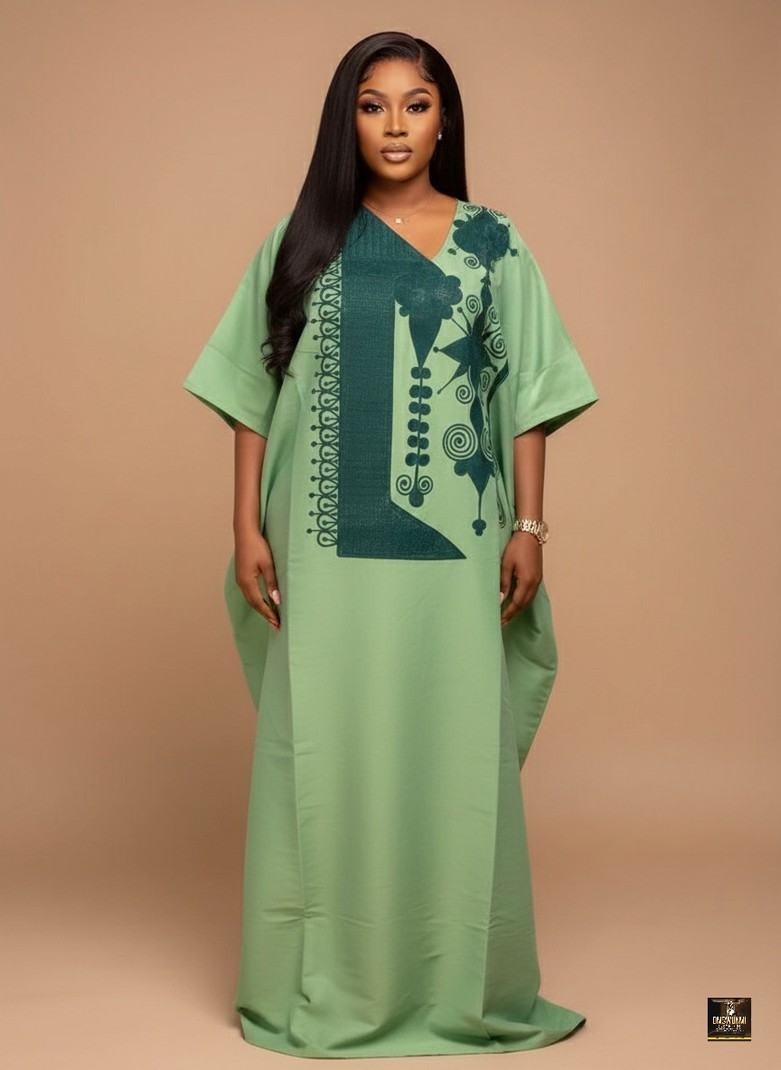 This Elegant Sage Green Kaftan is a stunning piece that seamlessly blends traditional flow with modern sophistication, making it an essential addition to any discerning wardrobe. Crafted from a premium, smooth Crepe fabric, the dress offers a beautiful drape, ensuring both comfort and an effortlessly graceful silhouette that moves fluidly with the wearer. The serene, solid sage green hue forms the foundation of the garment, while the upper-chest area is adorned with a captivating, darker forest-green panel featuring an intricate, stylized motif pattern. This design detail, characterized by a mix of geometric and organic shapes, provides a striking visual contrast and a touch of cultural artistry. The kaftan's design is defined by its flattering, wide, dolman-style sleeves and a relaxed fit that extends to the floor, culminating in a simple V-neckline. This versatile garment is ideally suited for a variety of occasions, ranging from elegant evening dinners and festive holiday gatherings to formal ceremonies like weddings or naming celebrations, and even as a chic, yet comfortable, option for a resort vacation or cruise wear.