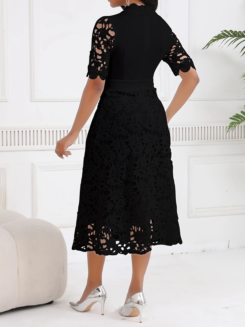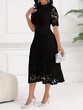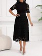 Elegant Women'S Lace Dress - Blue Floral Pattern, Short Sleeve, Crew Neck, Knee-Length with Waistband and Hem Detail, Fashionable and Comfortable for All Seasons