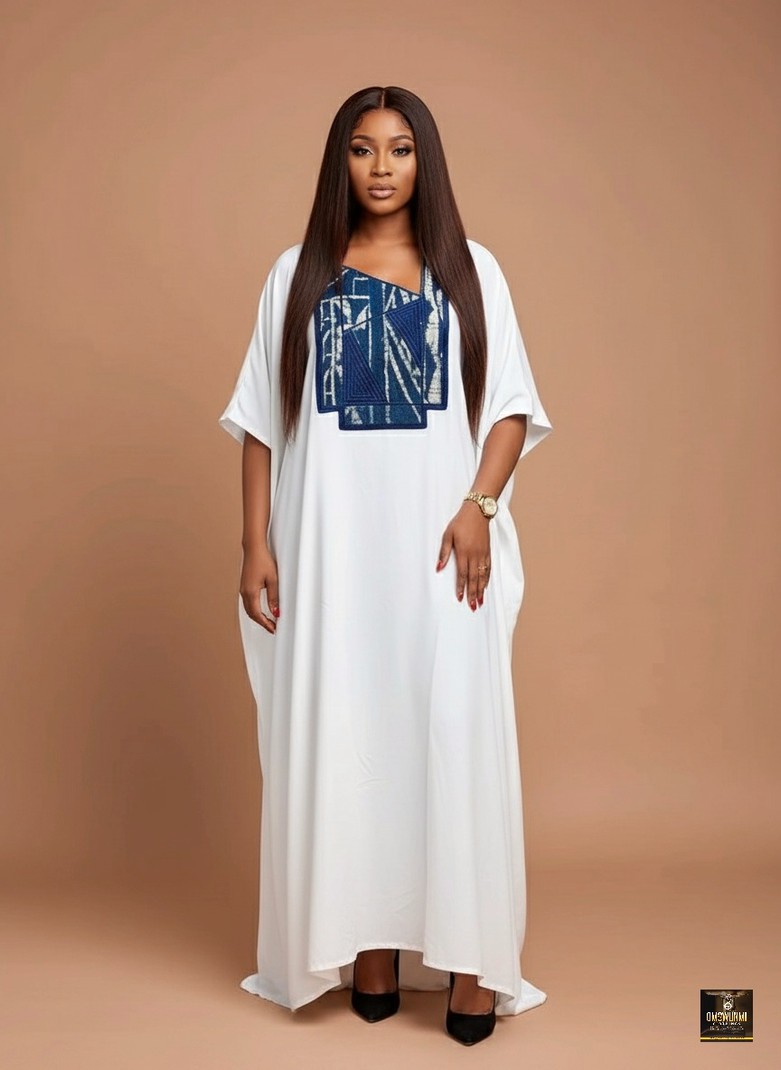 A chic, minimalist white maxi kaftan featuring a striking patchwork of indigo embroidered across the chest. The fluid, loose silhouette offers exceptional comfort and freedom of movement, while the deep V-neckline adds a touch of modern sophistication.