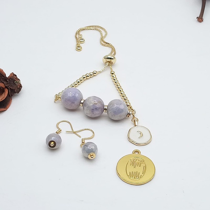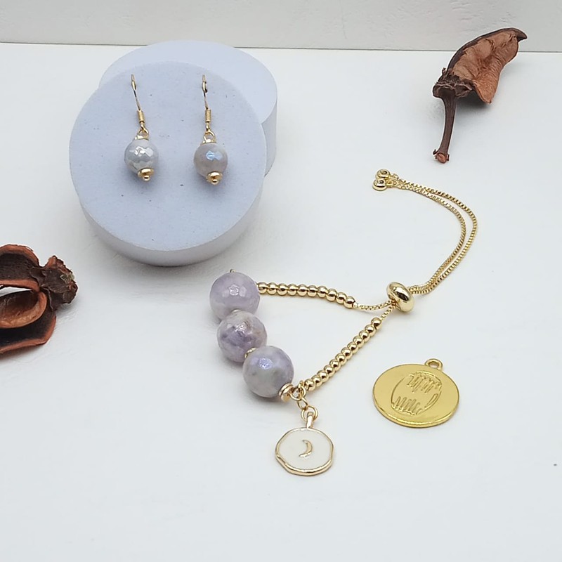 Ensemble Bracelet ajustable et Boucles d'oreilles en perles naturelles Mauve.
