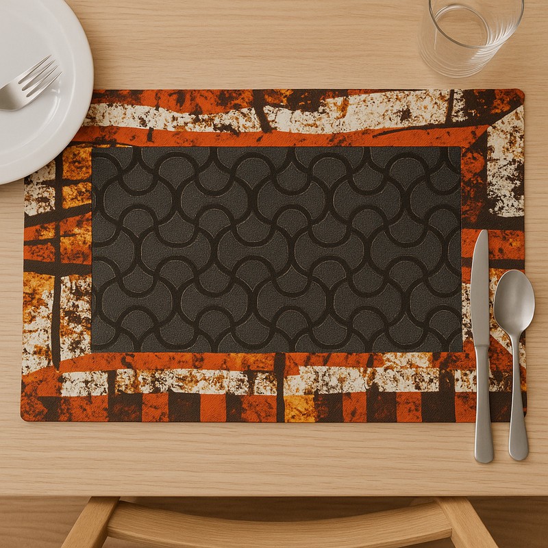 Ensemble de 05 Sets de table rectangulaire "Terre de Brique" Dimensions : 30 x 45 cm Forme : Rectangulaire Matière : Tissu polyester déperlant Couleurs : Terracotta, noir, blanc cassé Entretien : Lavable en machine à 30°C