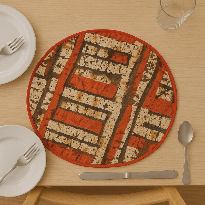 Ensemble de 05 Sets de table ronds "Terre de Brique" Diamètre : 38 cm Forme : Ronde Matière : Tissu épais et résistant Couleurs : Rouge, crème, brun Entretien : Lavable à la main