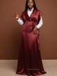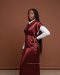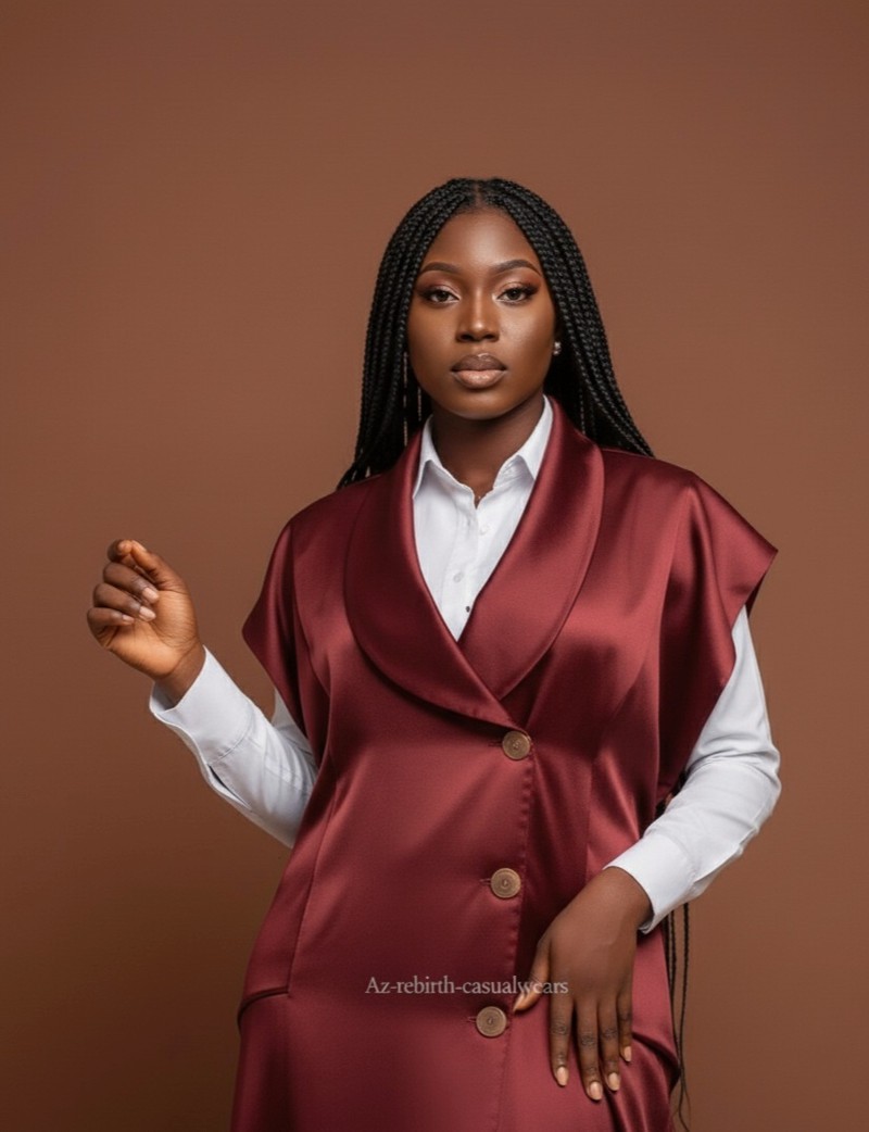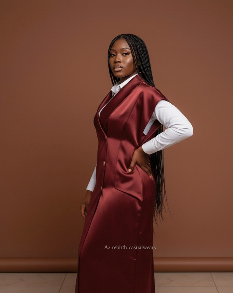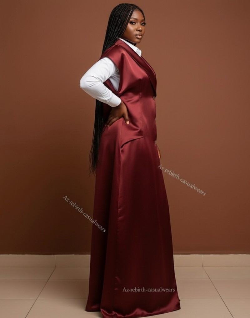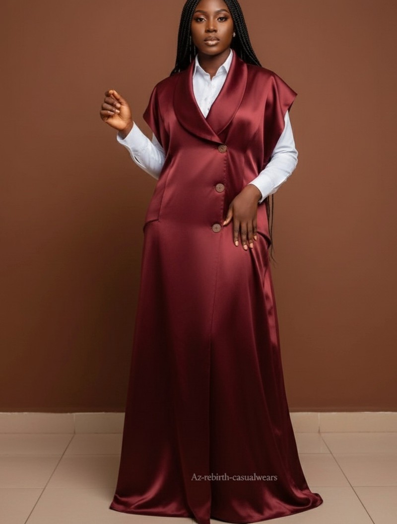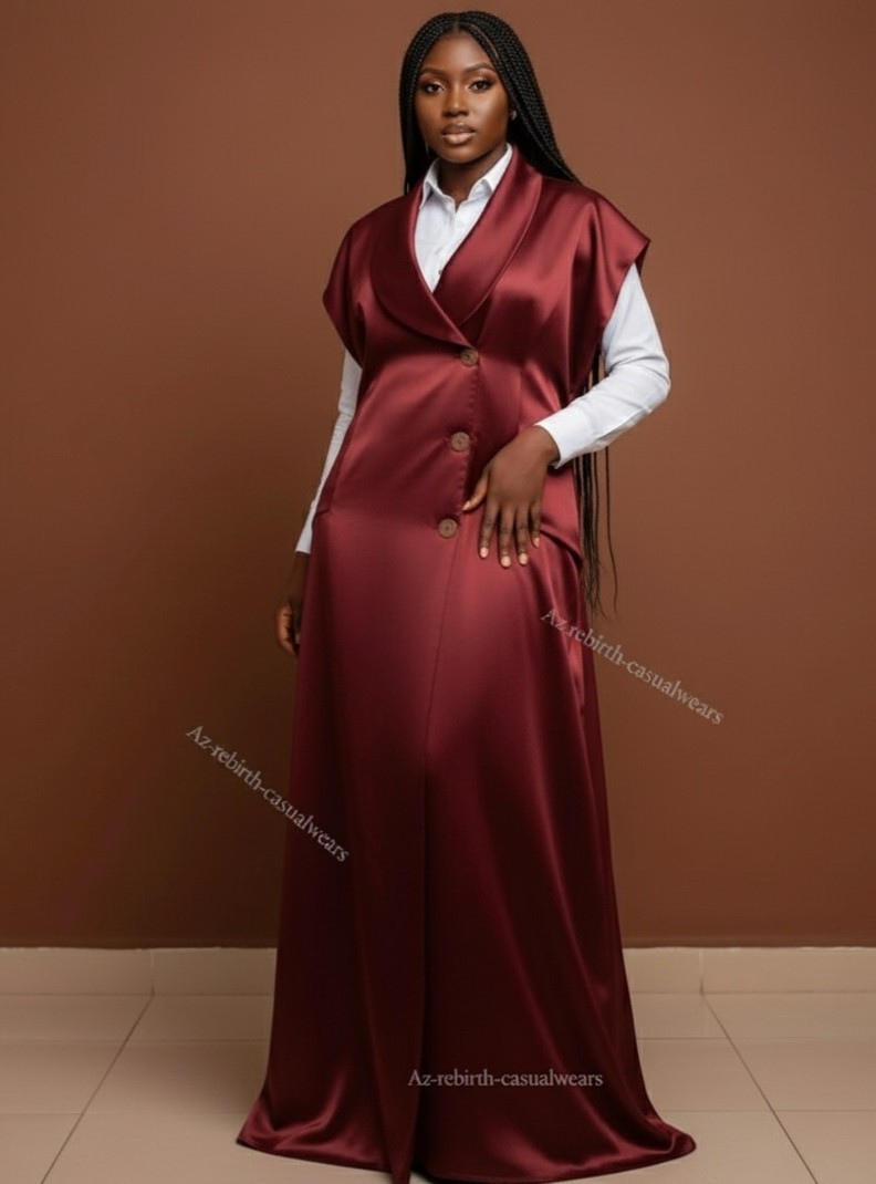 Ajoutez une touche de luxe à votre garde-robe avec cet ensemble magnifique composé d'une longue robe sans manches en satin d'un Bordeaux/Marron riche et profond, dotée d'un col structuré et de boutons décoratifs. Elle est parfaitement superposée sur une chemise blanche classique à manches longues.