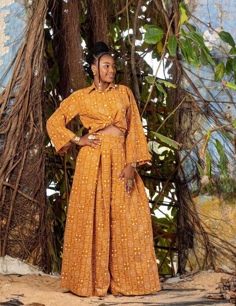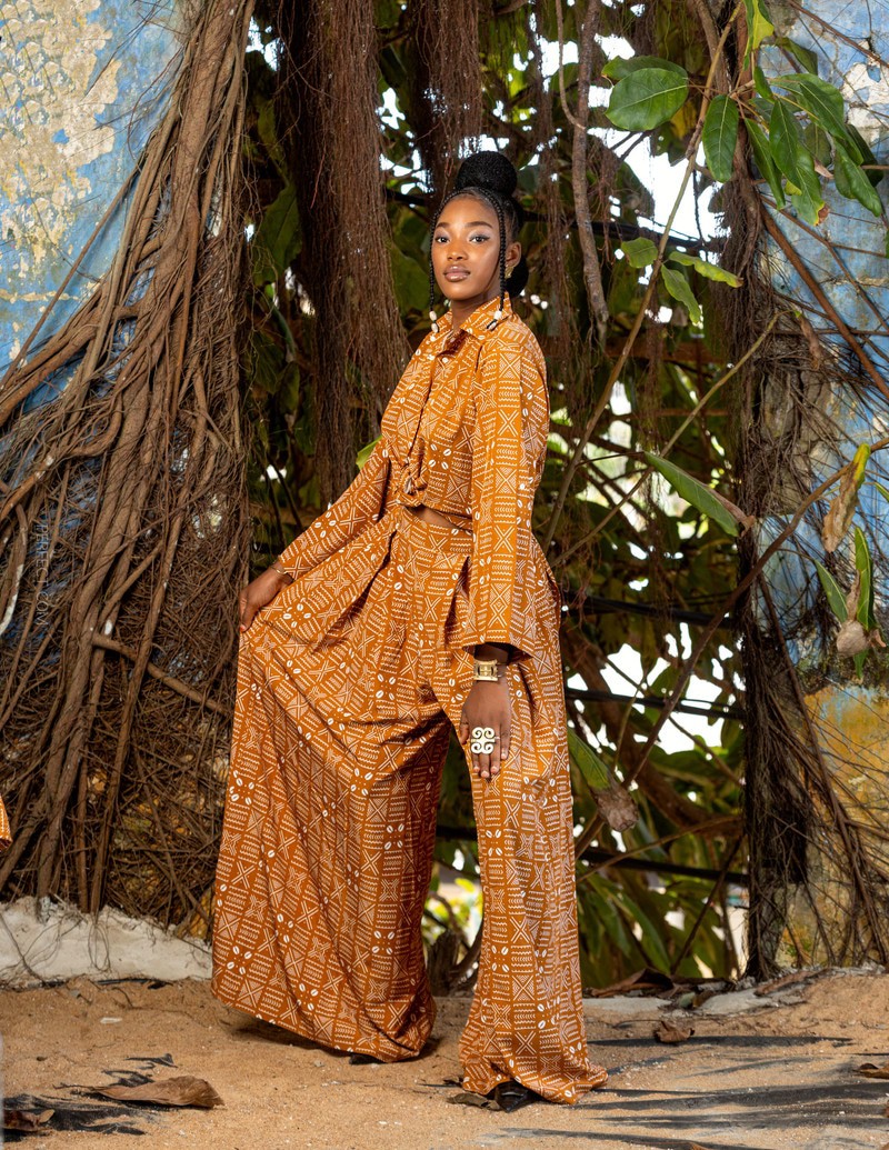 L’ensemble Moya incarne l’élégance décontractée et le confort absolu. Confectionné dans un satin fluide aux motifs Bogolan et touches d’inspirations cauris, il allie héritage culturel et modernité.