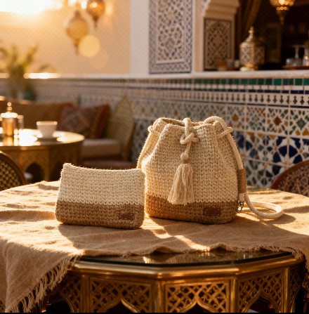 🍎 Sac Goffa Buck blanc – Édition artisanale BHANDI x The Marocain Vibrations Crochet point V 7 mm | Coton & jute naturels | Fabriqué main au Maroc ✨ Le crochet dans sa forme la plus pure Le sac Goffa Buck est une création 100 % crochet, conçue à la main avec un point en V au crochet n°7. Sa forme douce, sa texture ajourée et son style épuré évoque une modernité naturelle. Pensé par Kouatar, fondatrice de BHANDI, en co-création avec The Marocain Vibrations, ce modèle offre une esthétique élégante et polyvalente à celles qui aiment les pièces de caractère. 📀 Dimensions & accessoires (approximatives – chaque pièce étant unique) - Sac : ~24 × 28 cm (≈ 9.5 × 11 in) - Pochette intérieure : ~24 × 14 cm (≈ 9.4 × 5.5 in) - 2 cordons : ~17 cm (≈ 6.7 in) pour port main ou attache pochette - 1 bandoulière : ~100 cm (≈ 39.4 in.) - 2 rallonges : ~20 cm (≈ 7.9 in) chacune, pour un port à la hanche ou sous le bras selon les envies - Emballage : sac écrin en coton 🧵 Chaque ensemble nécessite entre 15 et 17 heures de travail artisanal. Des irrégularités peuvent apparaître, gage d'un travail manuel unique. ✅ Caractéristiques clés - Technique : 100 % crochet (point en V) - Crochet utilisé : n°7 - Matières : • Coton naturel • Jute végétal • Assemblage au Maroc - Temps de fabrication : 15 à 17 heures - Couleurs : blanc & jute naturel - Style : minimaliste, bohème chic, naturel - Port modulable : à la main, à l'épaule ou en croisé - Accessoires inclus : bandoulière, rallonges, cordons, pochette et écrin 🌿 Pourquoi l'adoptant ? - Une pièce 100 % artisanale, façonnée avec soin - Design élégant et fonctionnel - Adapté à toutes les morphologies et styles - Une collaboration authentique et porteuse de sens - Un sac à porter comme une signature textile 🧼 Entretien - Lavage à la main à froid - Séchage à plat, à l'ombre - Ne pas tordre ni repasser - Éviter les surfaces rugueuses 📌 Un sac né d'un dialogue entre cultures, matières et gestes, il incarne l'équilibre rare entre mémoire artisanale et allure contemporaine. BHA_GOF_BUCWH_V07