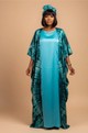 This luxurious Kaftan ensemble is masterfully crafted from a combination of lustrous silk-satin and authentic hand-dyed Adire silk, offering a rich, multi-dimensional texture that radiates opulence. The set features a sleek, floor-length middle dress in a vibrant turquoise blue, elegantly layered with a voluminous, side batik that showcases deep teal and charcoal tie-dye patterns. To complete the regal look, it is paired with a matching structured silk headwrap and a signature gold chain wristwatch, creating a cohesive aesthetic that balances traditional craftsmanship with modern glamour. This ensemble is an exceptional choice for high-profile weddings, prestigious evening galas, or festive cultural celebrations where a commanding and sophisticated presence is desired