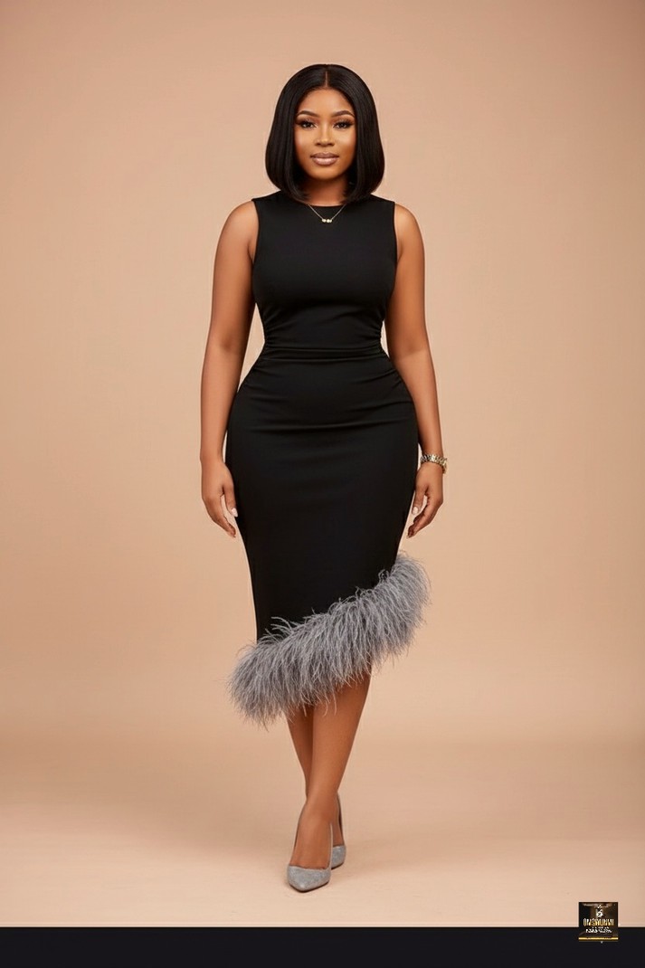 This sophisticated midi-length dress is expertly tailored from a premium stretch crepe fabric in a soft black hue, offering a body-conforming silhouette with elegant ruched detailing along the side. The dress features a sleeveless, round-neck bodice and is dramatically elevated by a luxurious grey ostrich feather trim that sweeps diagonally across the hemline, adding a sense of high-fashion movement. This ensemble is an exquisite choice for cocktail parties, high-profile birthday celebrations, or upscale evening events where you want to balance modern minimalism with bold, opulent textures.
