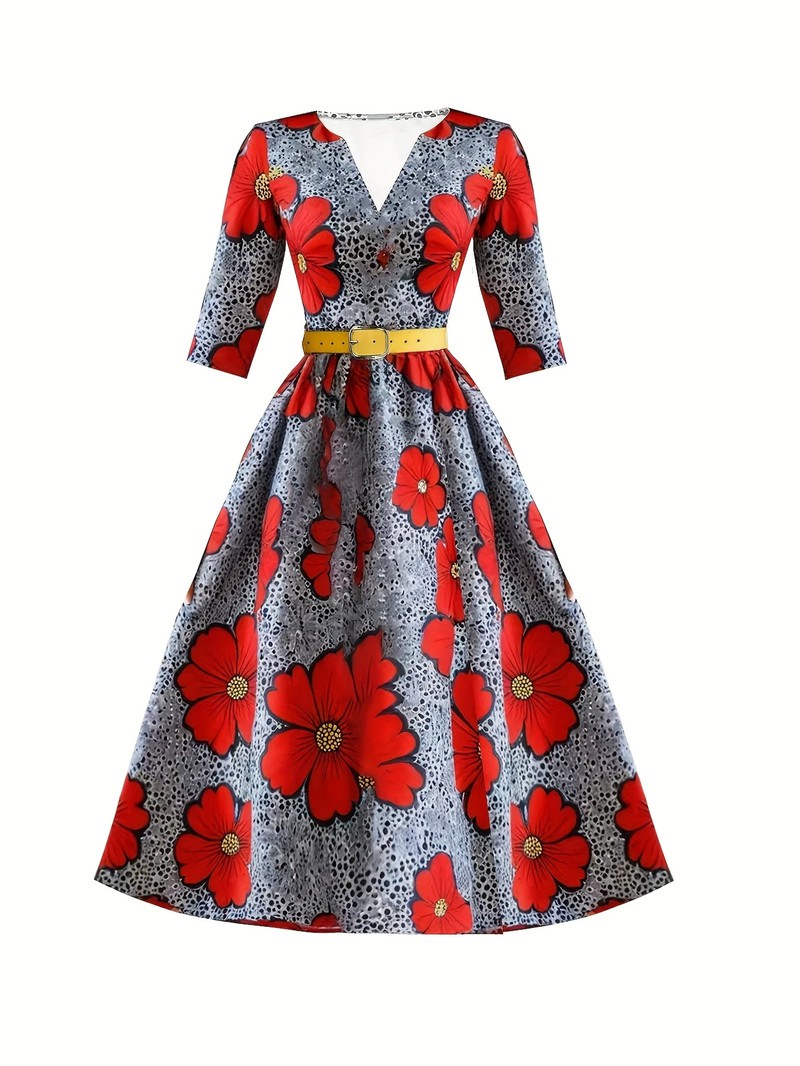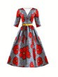 European and American Style V-Neck Printed Waist-Cinched Dress