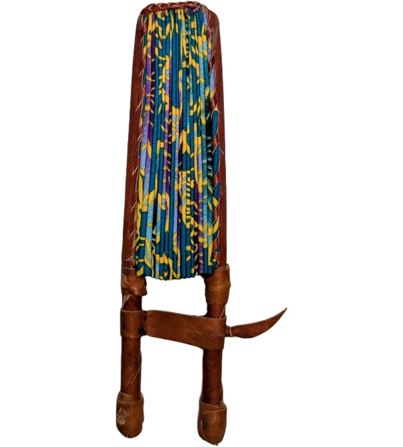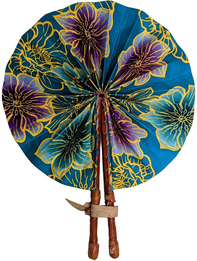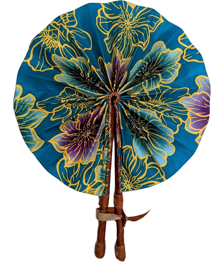Confectionné à la main, cet éventail combine avec finesse les tissus africains wax colorés et le cuir de qualité, promettant non seulement durabilité mais aussi un style inégalé.