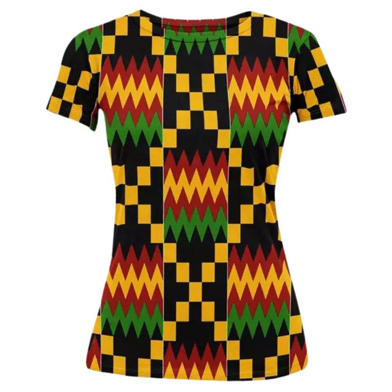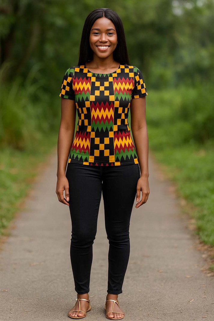 This beautifully designed African Print Women T-Shirt in Kente Print is a must-have for any wardrobe. The vibrant, cultural colors are eye-catching and full of character, it is soft and comfortable on the skin. The high-quality fabric adds a touch of luxury while still being breathable and lightweight. Wear this with confidence knowing it will always look fashionable and stylish. Product Features Please Compare your Measurements To our Size Chart This T-shirt is Designed for fashionable women. Made from 5.47 Oz. 100% polyester. Double-needle hemmed sleeves and bottom. Vivid print that will never fade after washing Soft, lightweight and quick drying. Delivery Time This item will be processed within 3-7 business days (Excluding Weekends and Holidays). Once products ships it can take up to 15 Business days depending on your location. Out of Stock items can be requested by emailing us at [email protected] Care Instructions Machine wash cold inside out. Gentle cycle with mild detergent and like colors. Do not use bleach or fabric softener. Do not tumble dry. Hang to dry to ensure maximum shelf life. Iron inside out if necessary. Do not iron the print. Do not dry clean.