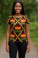 This beautifully designed African Print Women T-Shirt in Kente Print is a must-have for any wardrobe. The vibrant, cultural colors are eye-catching and full of character, it is soft and comfortable on the skin. The high-quality fabric adds a touch of luxury while still being breathable and lightweight. Wear this with confidence knowing it will always look fashionable and stylish.
