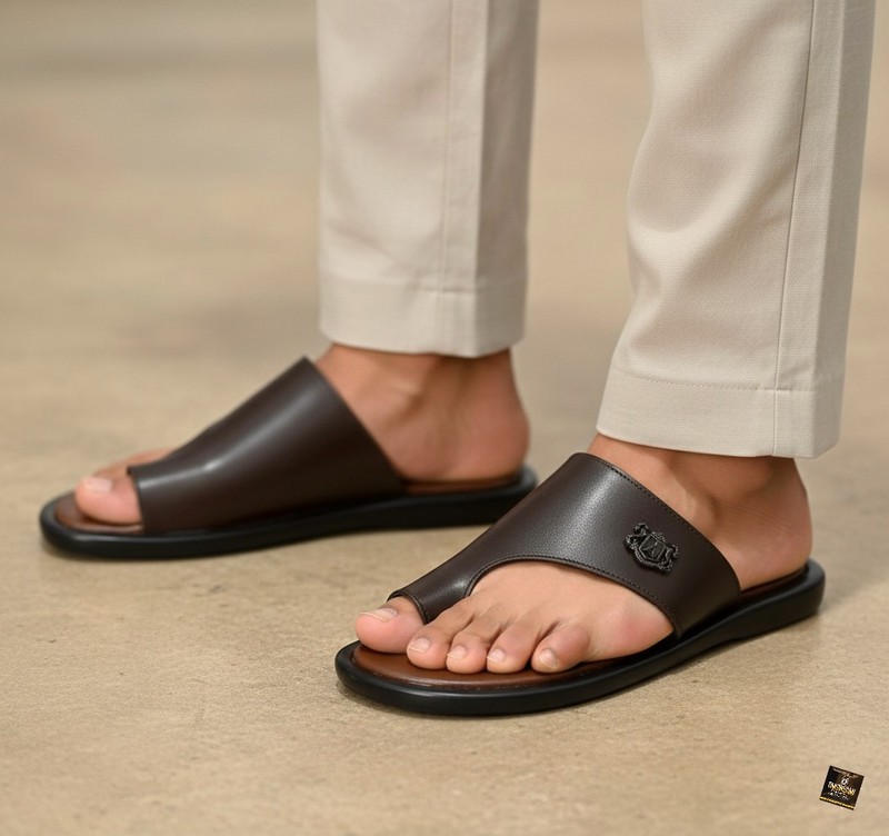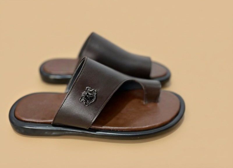 Crafted from premium, high-shine dark brown leather, these sophisticated toe-loop slides feature a sleek, minimalist strap adorned with a subtle tonal crest emblem for a touch of understated luxury. The design is engineered for both style and comfort, utilizing a contoured brown footbed paired with a durable black rubber outsole that provides excellent grip and all-day support. These slides are the perfect choice for elevated warm-weather occasions, such as casual business brunches, coastal vacations, or evening social gatherings where you want to maintain a polished yet relaxed appearance.