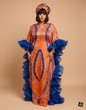 Make a stunning entrance in this vibrant orange and royal blue Adire silk maxi gown, a masterpiece that beautifully marries traditional West African artistry with high-fashion drama. The garment is expertly crafted from premium, hand-dyed silk or polished cotton, featuring a striking sunburst tie-dye pattern that radiates energy and artisanal charm. The silhouette is defined by its breathtaking voluminous blue organza ruffles that frame the wide sleeves and cascade down the sides, creating an ethereal sense of movement and luxury with every step. Accompanied by a matching patterned headwrap to complete the regal ensemble, this gown is the ideal choice for high-profile weddings, cultural galas, red-carpet events, or any milestone celebration where you want to embody grace and bold sophistication.