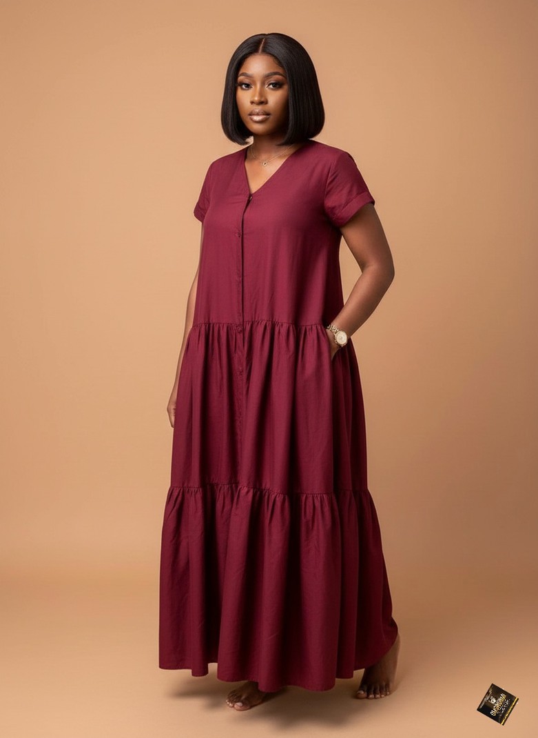 This sophisticated floor-length tiered maxi dress is a study in effortless elegance, featuring a rich burgundy hue that radiates a sense of refined warmth. Expertly crafted from a high-quality, breathable crepe material, the garment offers a smooth, lightweight feel and a crisp drape that maintains its beautiful, voluminous shape throughout the day. The design is characterized by a classic V-neckline, a functional button-down front, and subtle short sleeves, while the tiered skirt adds a sense of playful movement to the structured silhouette. This versatile dress is an ideal choice for a variety of occasions, from upscale garden parties and afternoon weddings to sophisticated holiday hosting or a refined dinner at a tropical resort.