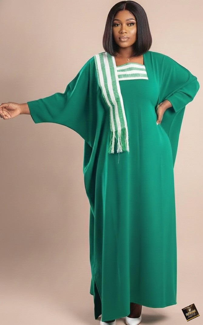 This graceful emerald green kaftan dress is a masterclass in modern minimalism fused with traditional flair, featuring a fluid, floor-length silhouette that exudes effortless sophistication. Meticulously crafted from a premium crepe blend, the fabric provides a luxurious, heavy drape that resists wrinkling while remaining breathable and soft against the skin. The design is elevated by a striking hand-loomed Aso Oke panel in ivory and green, which drapes elegantly from the square neckline and is finished with delicate fringe detailing for added movement. Featuring dramatic batwing sleeves and subtle side slits for ease of motion, this kaftan is the ultimate choice for high-profile religious ceremonies, elegant evening receptions, or sophisticated hostessing, offering a regal and comfortable look when paired with classic white pumps and silver accessories.