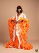 Radiate sun-drenched elegance in this breathtaking orange and white Adire maxi gown, a high-fashion masterpiece designed for the woman who loves to make a grand entrance. This floor-length kaftan is meticulously crafted from premium, breathable hand-dyed cotton, featuring a striking burst-patterned tie-dye that creates a regal, lengthening effect. The garment is defined by its extraordinary voluminous orange organza ruffles that cascade dramatically down the sides and frame the flared sleeves, providing an ethereal sense of movement and luxury. Accompanied by a matching patterned headband to complete the coordinated look, this ensemble is the quintessential choice for high-profile tropical weddings, luxury resort evenings, or prestigious cultural galas where bold sophistication is required.