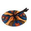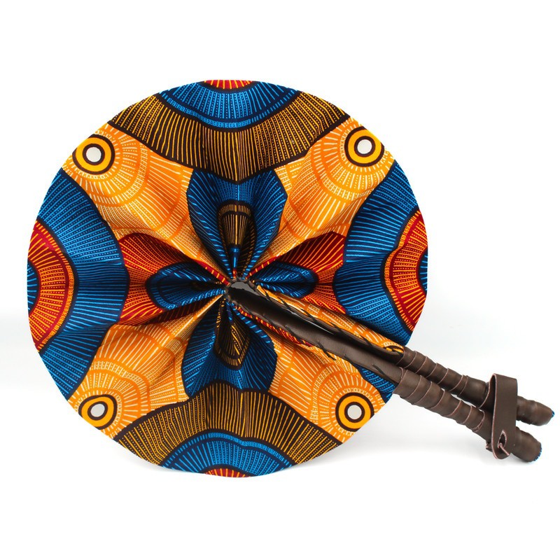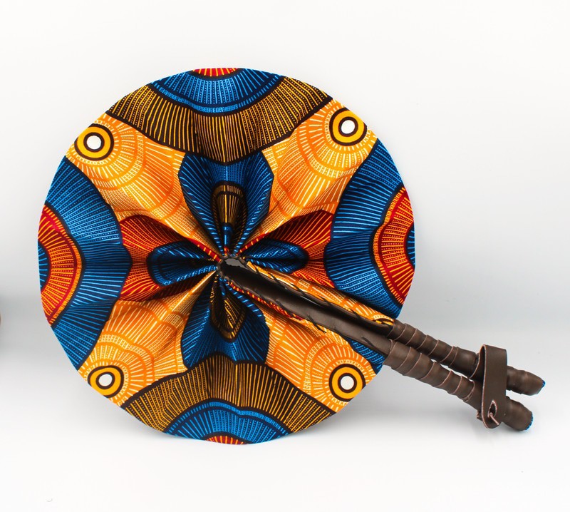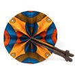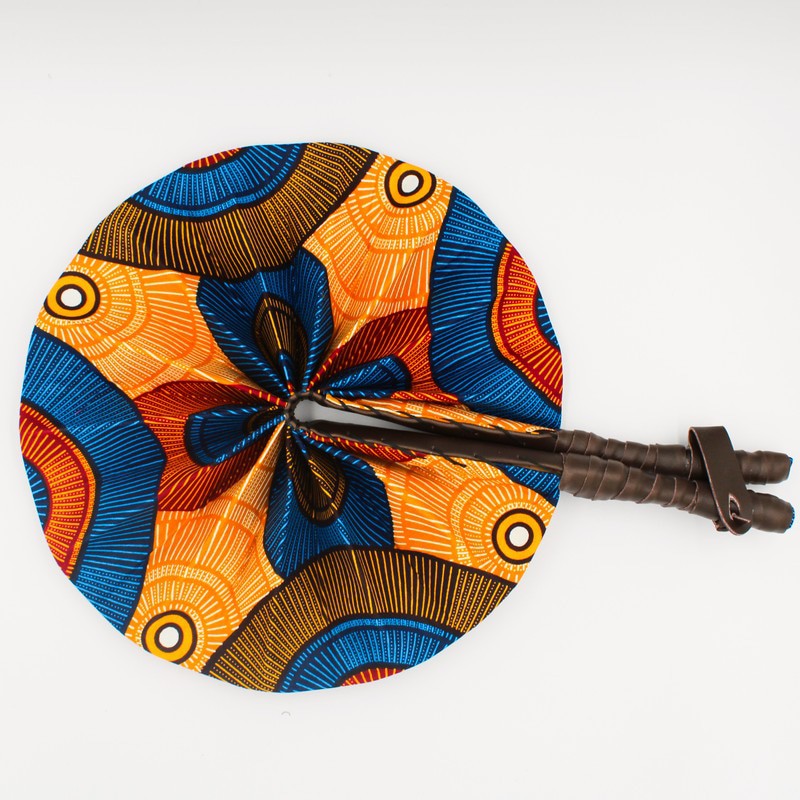 Featuring a striking circular print in warm tones of orange, mustard, and black, this fan reflects traditional West African aesthetics with a modern edge. The disc motif symbolises unity, completeness, and rhythm—echoing the beat of culture and movement.
