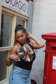 • Bold Ankara print with circular "rich disc" motif in orange, mustard, and black