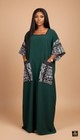 This comfortable and culturally inspired maxi-dress offers an effortless blend of relaxed silhouette and striking graphic detail, perfect for stylish everyday wear or semi-casual events. The dress features a dramatically oversized and flowing kaftan silhouette with a clean square neckline and wide, knee-length sleeves, ensuring a comfortable, airy drape, and is constructed from a soft, substantial heavy crepe fabric in a deep, sophisticated forest green hue. The garment is beautifully accented by a contrasting black and white geometric African print fabric which is used to trim the wide sleeves and create bold, generous patch pockets, injecting a focal point of cultural artistry and utility. This versatile and comfortable ensemble is an ideal choice for occasions such as casual weekend outings, running errands, or comfortable travel, informal social gatherings or casual parties, resort and vacation wear, or any relaxed setting where modest coverage and unique ethnic-inspired style are desired.