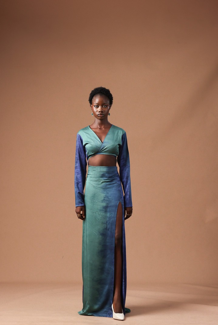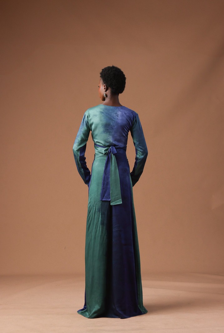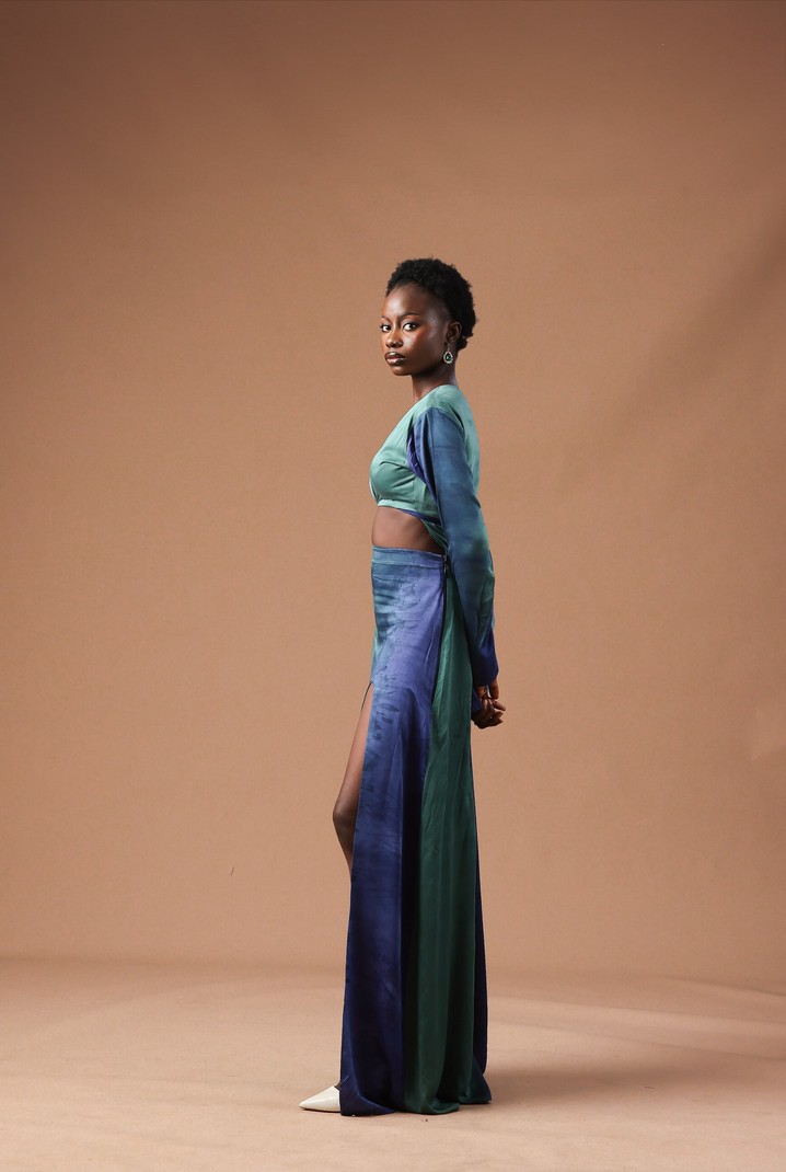 The Gangan Dress is a statement piece that combines elegance and boldness with a playful twist. Crafted from luxurious, locally dyed silk with a stunning gradient effect, each dress is unique thanks to the artistry of our skilled artisans. The cut-out details add a contemporary edge, while the bust knot and thigh-high slit bring a daring allure to the design. Perfect for making an entrance, the Gangan Dress celebrates both tradition and modern style, offering a blend of sophistication and striking details that ensure you stand out in any crowd.