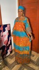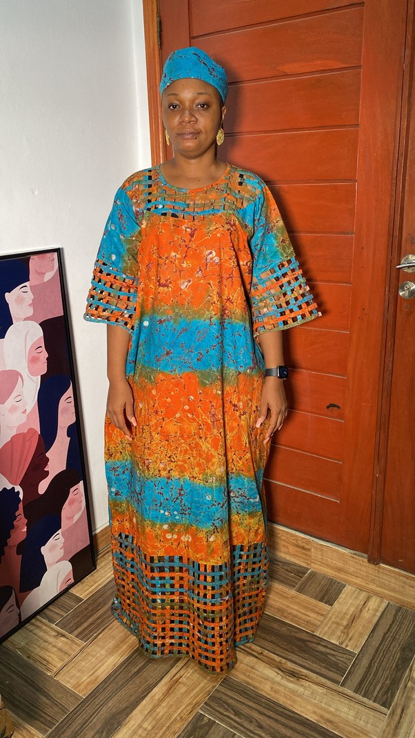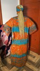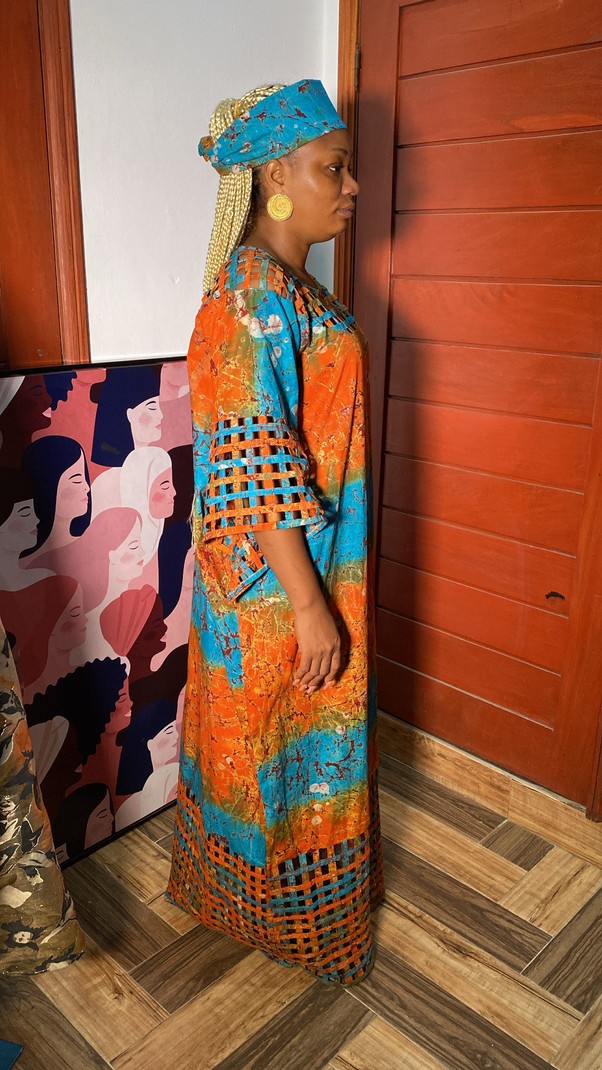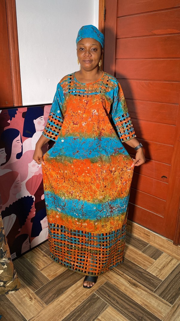 Magnifique Robe à garniture en Adire Batik Ghanéen Fait à la main, livré avec son Foulard.