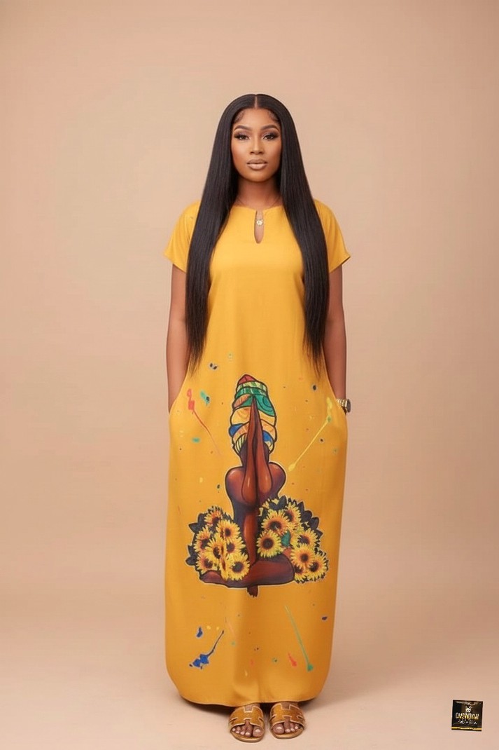 This Golden Sunflower Maxi Kaftan is a beautifully artistic and vibrant garment that channels warmth and natural beauty, making it an uplifting addition to any collection. Crafted from a soft, flowing crepe fabric, this piece offers superb comfort and breathability, allowing for a relaxed, easy drape. The rich mustard yellow hue of the fabric serves as a radiant backdrop for the centerpiece: a gorgeous, large-scale screen-printed illustration of a woman resting gracefully amidst a cluster of bright sunflowers, accented by intentional paint splatters around the artwork. The dress follows a comfortable, roomy maxi silhouette with subtle short sleeves and practical side pockets, designed for effortless style. This stunning kaftan is perfectly suited for casual gatherings, outdoor summer parties, vacation travel, beach outings, festivals, or simply making a bold and joyful statement on a regular day, promising a sunny disposition wherever it goes.