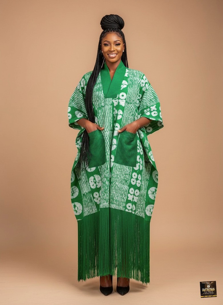 Make a bold statement with this stunning Geeen Fringe Kaftan Dress. Designed with traditional African patterns in warm mustard and ivory tones, it features oversized front pockets, a structured collar, and elegant fringed detailing at the hemline. Its free-flowing silhouette ensures comfort and ease while maintaining a sophisticated, cultural charm — perfect for elegant gatherings or stylish casual wear.