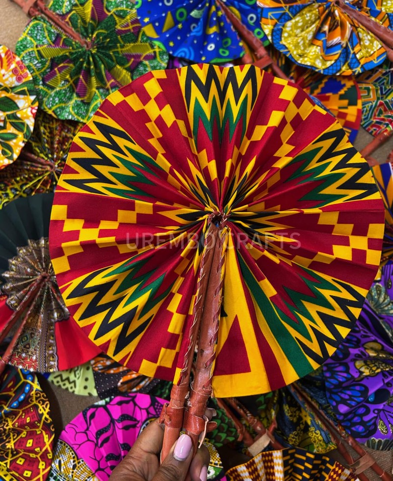 Handmade African Foldable Fan – Kente Print Add a burst of vibrant culture to your style with this authentic handmade African fan crafted from bold Kente fabric. Designed with traditional Ghanaian patterns in radiant red, yellow, green, and black, this fan is both functional and fashionable. Material: 100% Ankara fabric with genuine leather handles Design: Foldable and compact, perfect for handbags Uses: Great for festivals, cultural events, home décor, or sunny days Size: Approx. 12 inches when open Each piece is unique and handcrafted with love by Urembo Crafts.