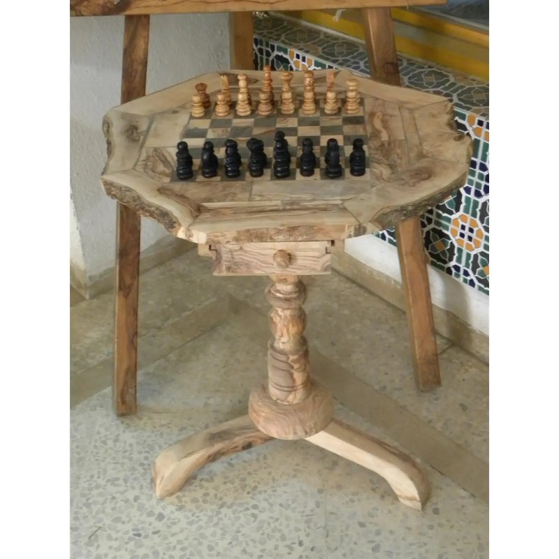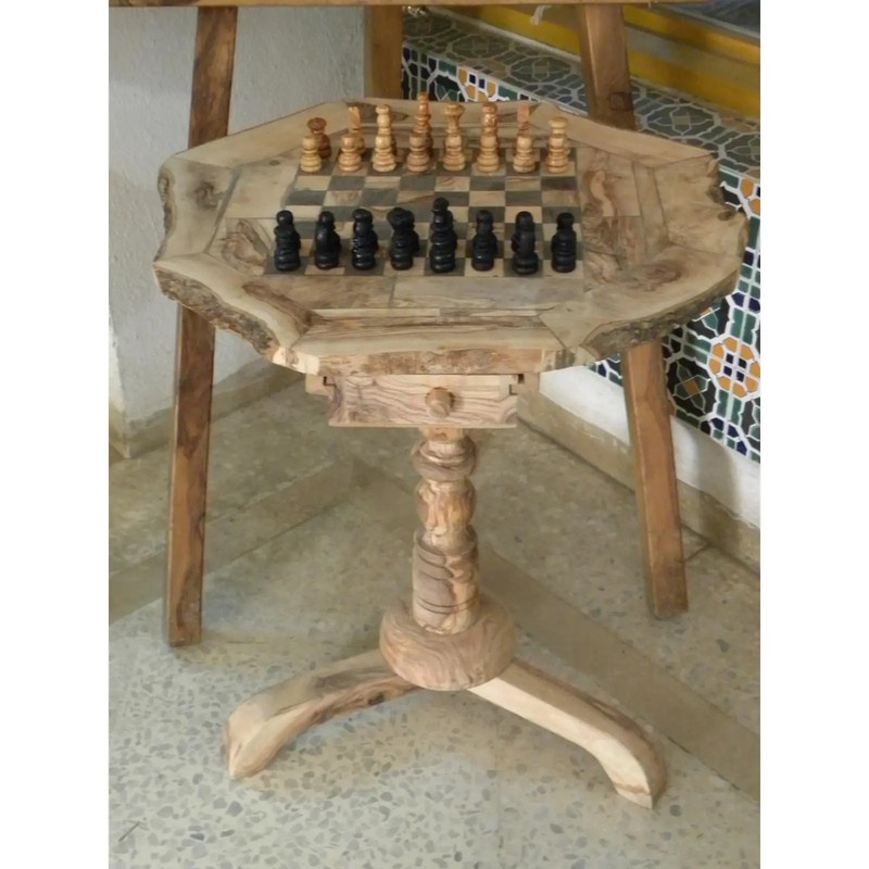 chess table made from olive wood storage drawer and 32 wooden pieces (pawn, king, rook, queen, knight and bishop) in olive wood, everything is entirely handmade.