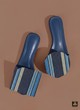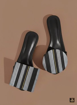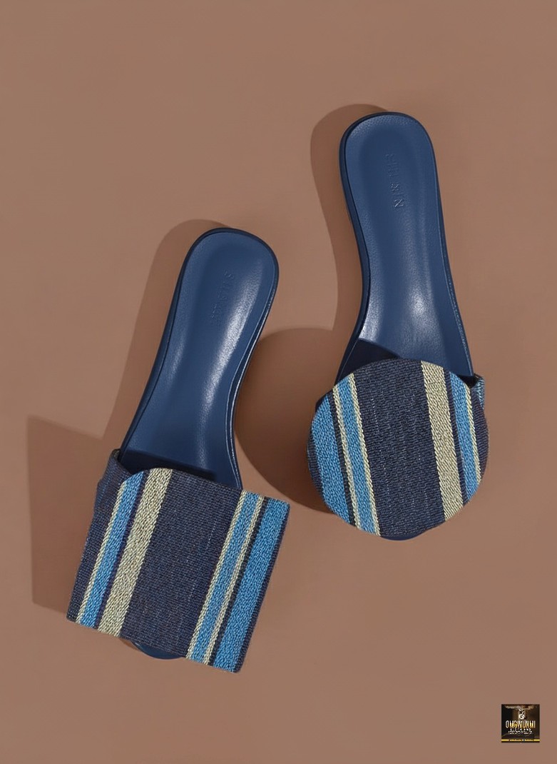 These sophisticated slip-on slides elevate casual footwear with their distinctive handwoven striped design and sleek profile. Each sandal features a wide, textured strap crafted from a textile material that showcases an elegant pattern of bold navy blue,sky blue and soft cream vertical stripes, subtly punctuated by a thin, bright golden or yellow accent line for a touch of refined contrast. The contrasting shape, one strap being square or rectangular and the other circular or rounded, offers a unique, asymmetrical flair, although they both maintain a cohesive aesthetic. Resting on a comfortable, low-heeled black sole and footbed, these slides are the perfect versatile accessory, effortlessly transitioning from daytime outings to evening casual wear while adding a modern, graphic element to any outfit.