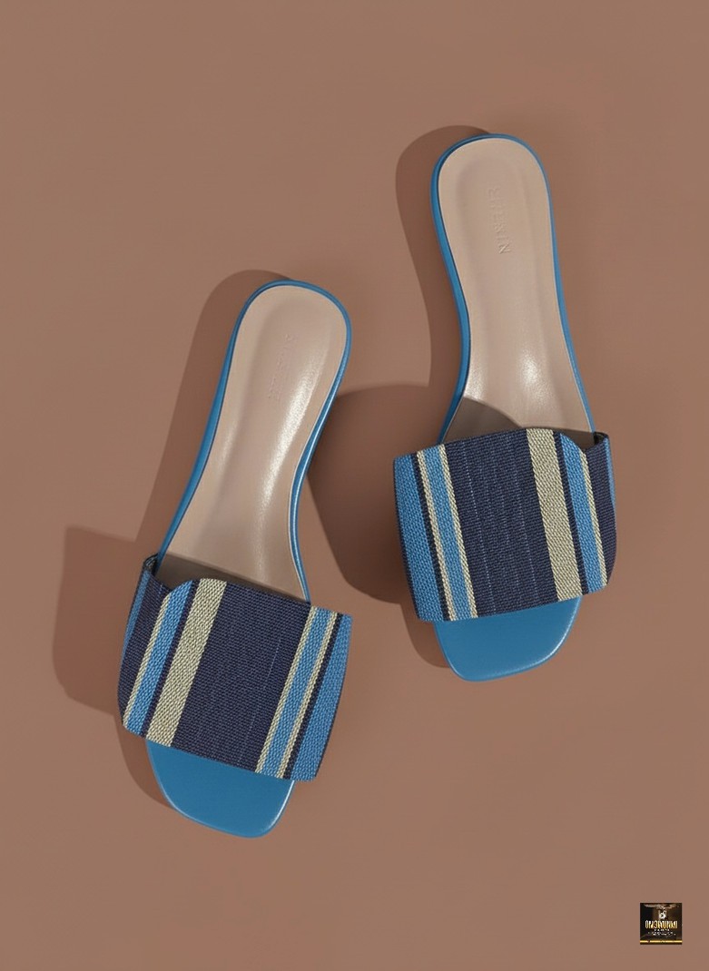 These sophisticated slip-on slides elevate casual footwear with their distinctive handwoven striped design and sleek profile. Each sandal features a wide, textured strap crafted from a textile material that showcases an elegant pattern of bold navy blue,sky blue and soft cream vertical stripes, subtly punctuated by a thin, bright golden or yellow accent line for a touch of refined contrast. The contrasting shape, being square offers a unique, asymmetrical flair, although they both maintain a cohesive aesthetic. Resting on a comfortable, low-heeled black sole and footbed, these slides are the perfect versatile accessory, effortlessly transitioning from daytime outings to evening casual wear while adding a modern, graphic element to any outfit.