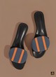 The standout element is the wide, eye-catching oval upper strap, constructed from a textured handwoven textile. This strap boasts a bold, athletic-inspired stripe pattern in a deep slate navy blue accented by striking burnt orange stripes. The colour combination is modern and warm, making these slides a versatile piece for high-summer elegance or transitional weather styling.