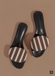 The standout element is the wide, eye-catching oval upper strap, constructed from a textured handwoven textile. This strap boasts a bold, athletic-inspired stripe pattern in a deep slate brown accented by striking cream stripes. The colour combination is modern and warm, making these slides a versatile piece for high-summer elegance or transitional weather styling.