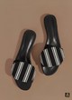 The standout element is the wide, eye-catching oval upper strap, constructed from a textured handwoven textile. This strap boasts a bold, athletic-inspired stripe pattern in a deep slate black accented by striking white stripes. The colour combination is modern and warm, making these slides a versatile piece for high-summer elegance or transitional weather styling.
