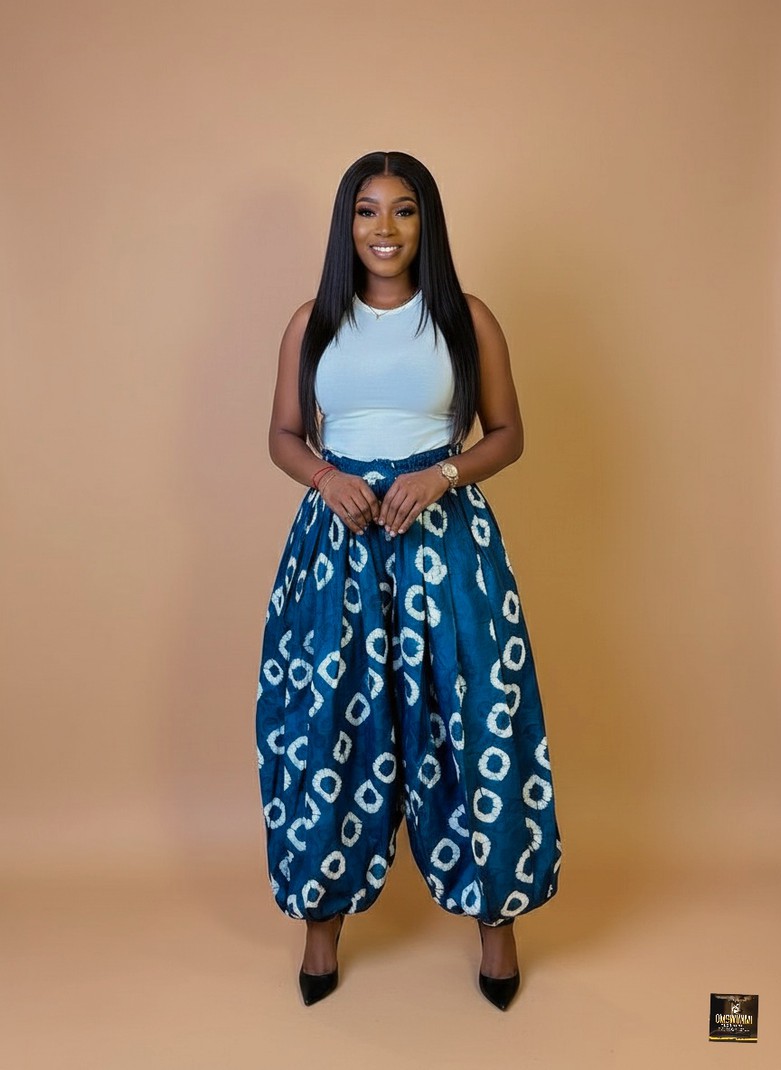 Made from a fluid, lightweight fabric featuring a mesmerizing blue and white Batik print. The flowing silhouette and rich colors make these trousers a standout piece. Paired here with a simple black fitted top to balance the volume.