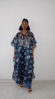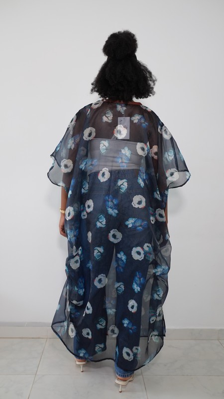 En organza léger, ce haut long joue sur la transparence, les volumes et la verticalité. Des lignes de pagne baoulé, plus ou moins épaisses, partent du col comme des traces de lumière et s’arrêtent à la poitrine ou au creux du ventre, selon leur course.