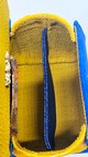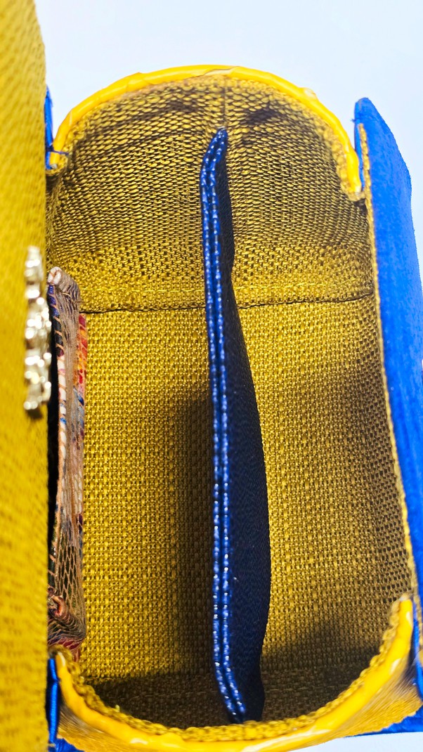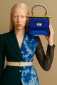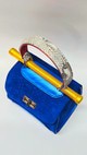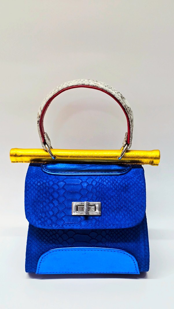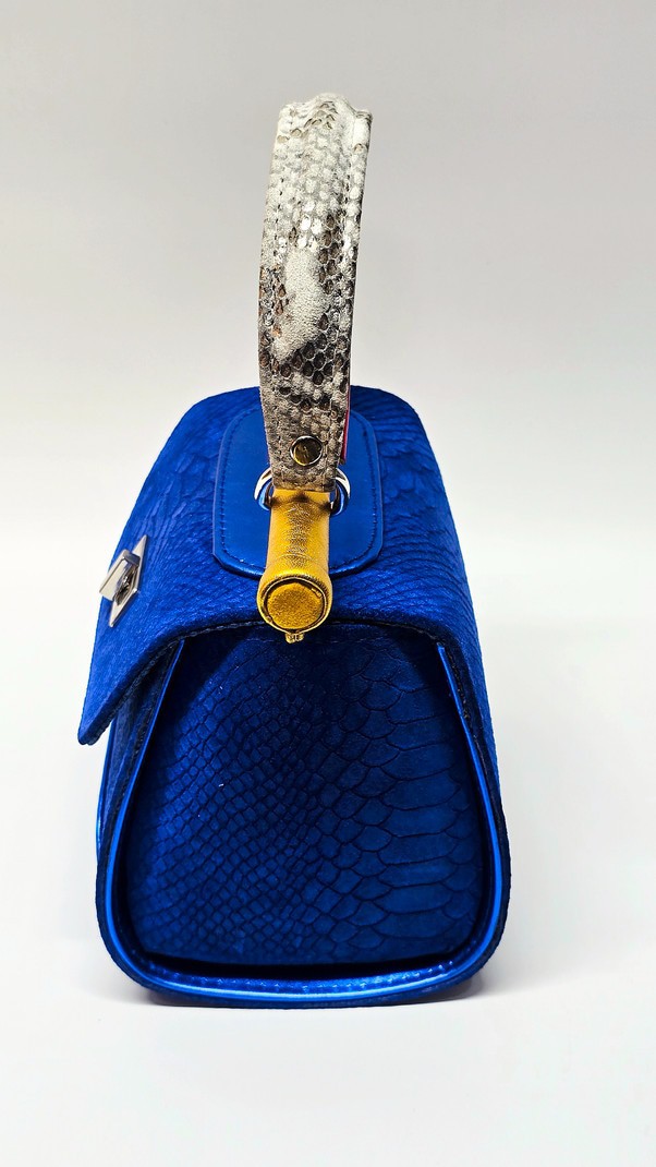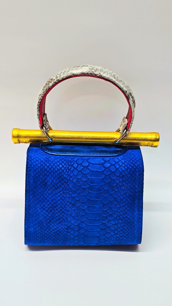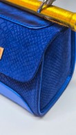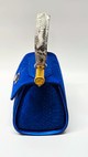 One-of-a-kind handheld bag in cobalt blue snakeskin-embossed suede with vivid yellow side panels and trim. White snakeskin-textured handle with scarlet underlayer, finished with gold hardware and metallic gold pipe.