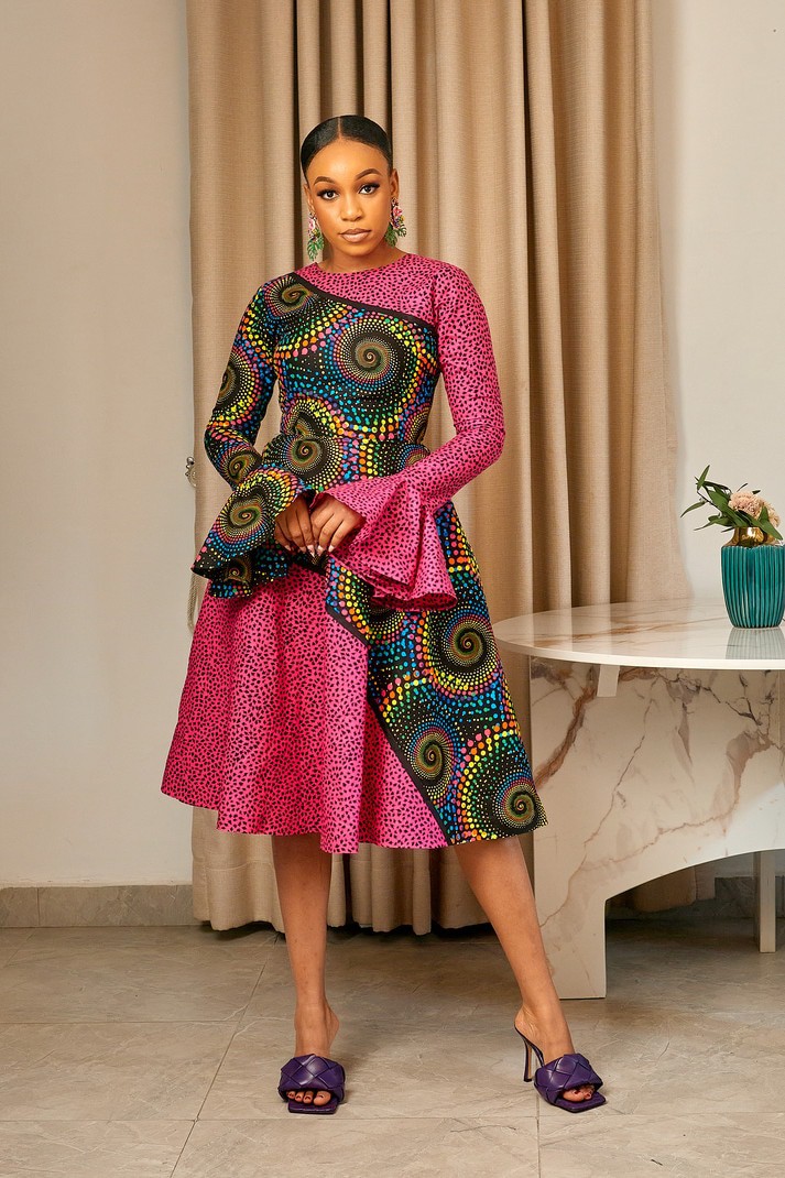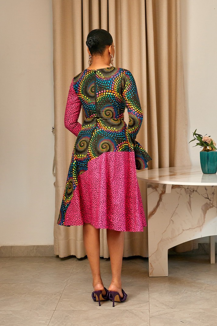 Embrace effortless elegance with the Winda Dress. This dress features flattering flare details that create a beautiful silhouette. The flowing flare sleeves add a touch of drama and femininity, making it perfect for everything from daytime outings to special occasions. Crafted from 100% cotton African Print Fabric, the Huso Dress is comfortable and stylish, promising to be a versatile addition to your wardrobe.