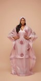 This ethereal and romantic full-length gown is crafted from a sheer, delicate blush pink or dusty rose organza fabric, giving it a light, airy, and glamorous feel. The design features a fitted or structured inner slip overlaid by a voluminous kaftan-style layer with wide, sheer batwing sleeves and a flattering V-neckline. The most enchanting detail is the placement of several oversized, dimensional fabric rosettes or blossoms that trail vertically down the center front of the dress, creating beautiful texture and a focal point. The sheer outer layer drapes elegantly over the fitted inner garment, ensuring a modest yet high-fashion look that is perfect for weddings, garden parties, or special evening galas. The outfit is completed with a coordinating ruched turban, enhancing the soft, feminine aesthetic.