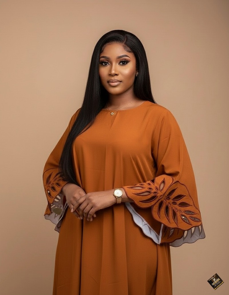This elegant, full-length kaftan dress comes in a rich, warm burnt orange fabric, offering a sophisticated and earth-toned look. The garment features a simple, classic round neckline and a characteristically loose, flowing silhouette that drapes beautifully for comfort and modesty. The most distinctive feature is the statement bell sleeves, which are adorned with exquisite laser-cut applique leaf/butterfly motifs. These cutouts are meticulously detailed, showcasing a lighter contrasting lining and small, subtle embellishments, adding texture and a delicate, feminine touch to the wide cuffs. This piece is perfect for making an impact at semi-formal events, engagements, or professional settings where refined, effortless style is desired.