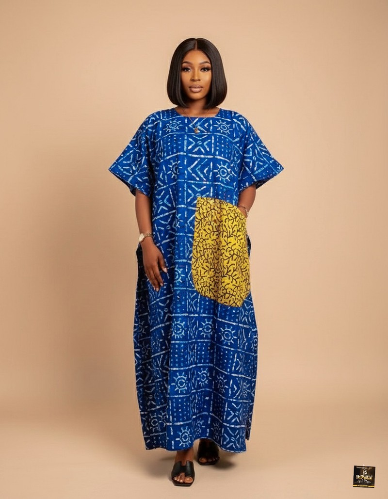 This piece is a magnificent and vibrant maxi dress, combining traditional patterning with contemporary comfort for a standout casual look. The dress boasts a relaxed, generous kaftan-style silhouette with simple, wide short sleeves and a modest boat neckline, ensuring ease of movement and exceptional comfort for various body types. The main body of the dress is adorned with a rich indigo-blue and white geometric mudcloth-inspired print, featuring intricate sunbursts and linear motifs arranged in a dynamic grid pattern across the full length. A striking point of visual interest is the large, contrasting patch pocket positioned at the hip, crafted from a bright mustard yellow fabric detailed with a contrasting black floral or swirl pattern, adding a bold pop of unexpected color and texture to the overall design. This full-length garment is perfect for warm weather or layering, representing a fusion of heritage design and modern versatility.