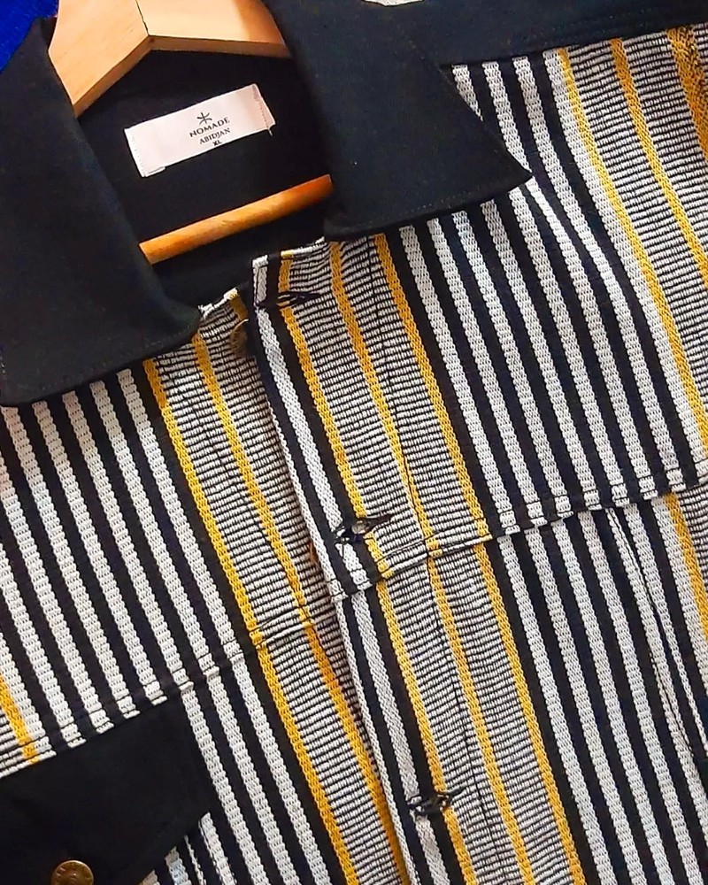 Jacket fait avec un tissus tissé par des coopératives en Afrique. du coton jusqu'à la finition, c'est du 100% Made in Africa.