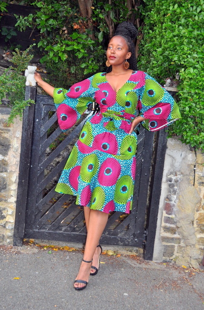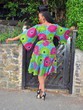 A gorgeous kimono sleeve dress in vibrant colours. The attached belt may be tied to the front or back. The smocking at the waist with the full skirt, gives a flattering silhouette. Unlined.