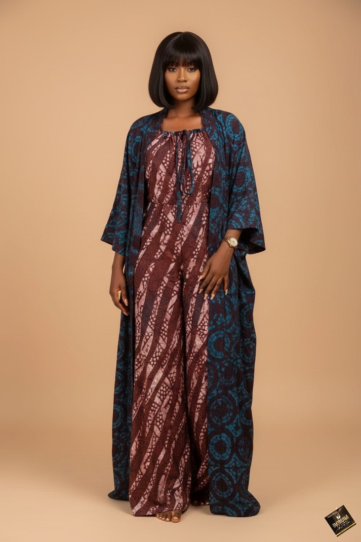 This exquisite collection features a floor-length, wide-leg jumpsuit gown paired with a sweeping longline kimono, all masterfully crafted from premium adire crepe for a luxurious, lightweight feel. The pieces are adorned with intricate Adire artistry, utilizing traditional hand-dyeing techniques to create vibrant patterns ranging from deep burgundy and violet leaf motifs to striking geometric designs in teal and earthy greens. These ensembles offer an effortless, regal silhouette with adjustable drawstring necklines and flowing sleeves, making them the ideal choice for high-profile cultural ceremonies, garden weddings, or sophisticated evening events where comfort meets high fashion. To complete the look, we recommend styling these pieces with a gold chain wristwatch and minimalist gold accessories to accentuate the rich, artisanal tones of the fabric.