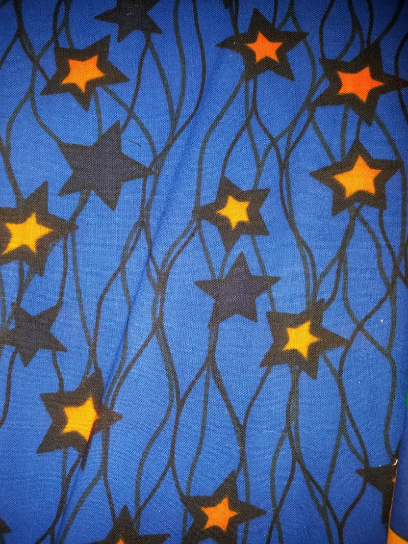 Cette parure est habillée du pagne wax " étoile " bleu roi, Etoile Orange et noir.