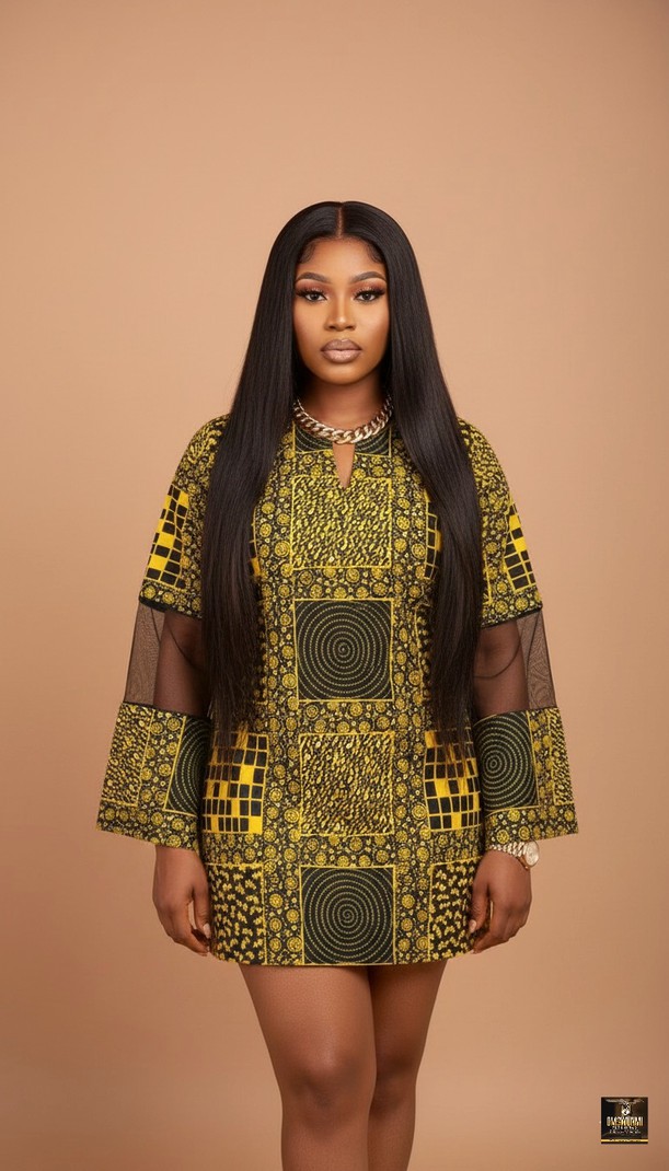 This stunning garment is a contemporary mini-dress defined by its striking yellow and black geometric print, made from a lightweight cotton Ankara fabric which provides both vibrant color saturation and a comfortable structure. The dress features a straight, shift-style silhouette that falls mid-thigh, offering a youthful and playful look. The neckline is a subtle V-cut or notched detail that complements the overall structure. A distinguishing feature is the three-quarter length bell sleeves, which are cleverly constructed with a large section of sheer black mesh or netting, creating an elegant contrast in texture and adding a sophisticated, airy lightness to the design. The bold, repetitive pattern, combined with the sheer sleeve detail, makes this a statement piece that is both culturally rich and modernly fashionable.