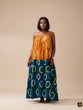 This eye-catching two-tone maxi dress showcases a vibrant fusion of traditional artistry and modern style, featuring a bold color-blocked batik design. The top bodice is rendered in a warm mustard orange with circular sunburst motifs, while the flowing skirt transitions into a deep teal blue adorned with contrasting organic ring patterns. Crafted from a premium, breathable cotton-blend fabric, this dress features delicate spaghetti straps and a gathered neckline that falls into a relaxed, voluminous silhouette for effortless comfort. Its striking patterns and easy-to-wear drape make it the perfect statement piece for artistic gallery openings, coastal resort vacations, or sun-drenched afternoon brunches.